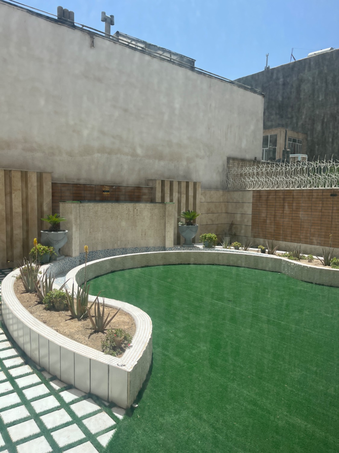 آبنما در حیاط و چمن مصنوعی 2 پارکینگ درگیر